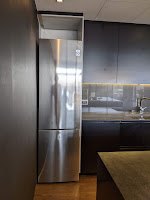 Our kitchen is a totally "built-in" [US] or "integrable" [Spain]: Death Star black cabinets hide everything, in a Euro-standard 60cm cabinet width layout. Our left-most cabinet has a separate congelador (freezer) and on a shelf above, a frigerífico (fridge). The congelador was dead, dead, dead. Simple, right? Order a new one, "integrable", and move on. Nope. The way the cabinet door mounts to the freezer has the cabinet door hinged as usual and connected to the freezer door by a clever/complex/stupid sliding mechanism; the new style (you see this in the US too) is to mount the door panel to the appliance, which means its hinges have to support the weight -- totally different mechanism, we might have to get a carpenter into re-cut the cabinet door to fit.